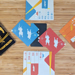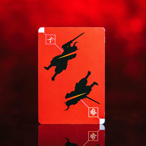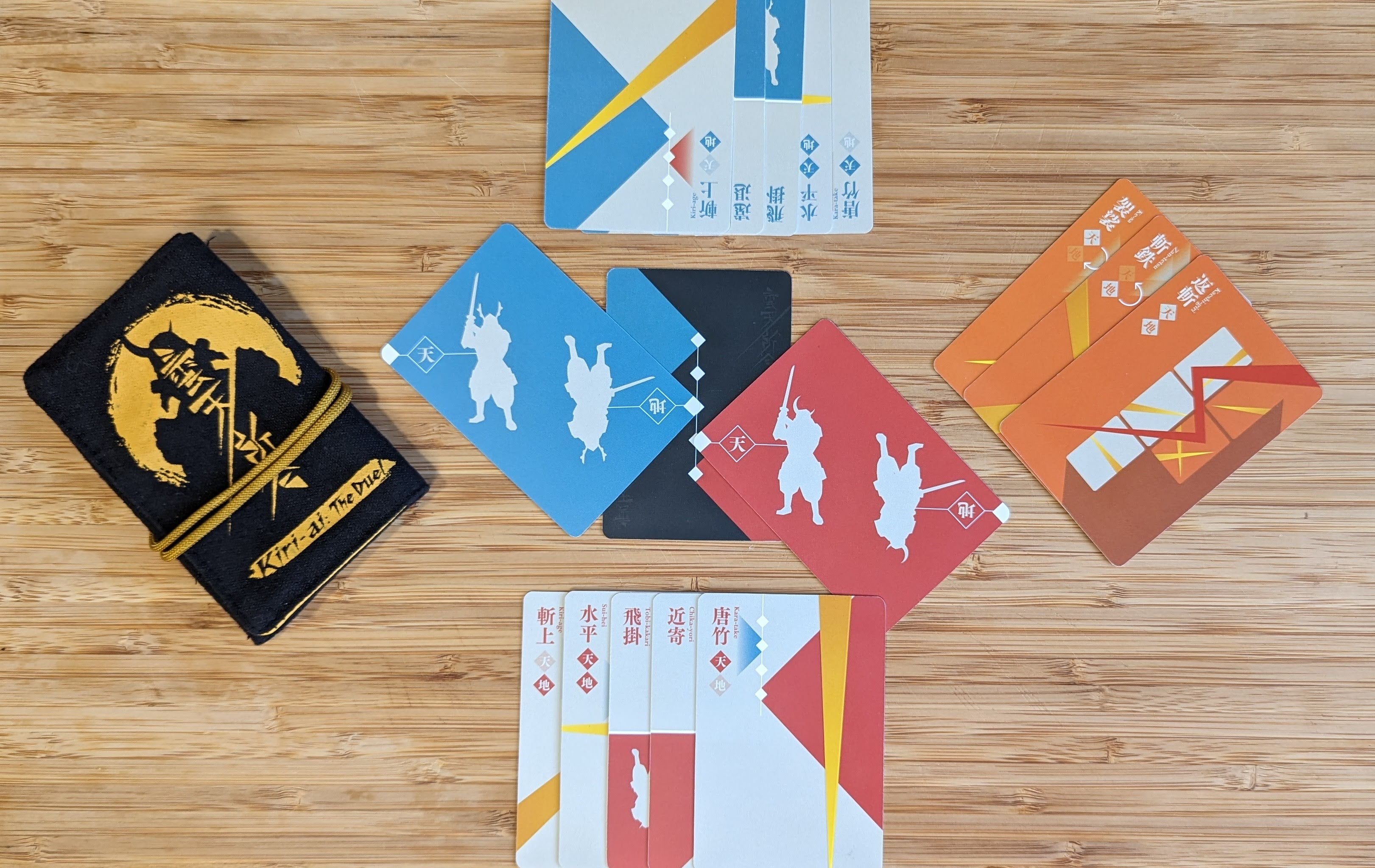 One player will be the Red Samurai and the other will be the Blue Samurai. Each player will receive the five cards matching the color of their Samurai Card and one random orange Special Attack Card to start their hand. The remaining Special Attack Card is discarded facedown.